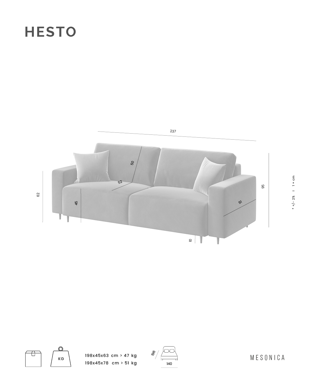 In addition, the sofa is equipped with a folding function. Folding backrests and sliding out part of the seat allow you to quickly transform the sofa into a comfortable bed. Hesto will fit perfectly into loft, modern interiors. Its unobvious character makes it an interesting element of the arrangement.